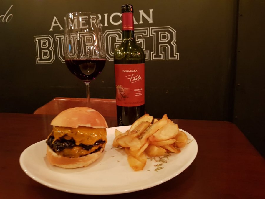 Este vinho harmonizou muito bem com o hamburguer do conde prime burguer. Escolhi o Taylor que é composto por pão, burguer, cheddar, cebola caramelizada. Assim a estrutura, o dulçor da cebola e os aromas defumados da carne, combinaram muito bem com os taninos e o sabor frutado do vinho.